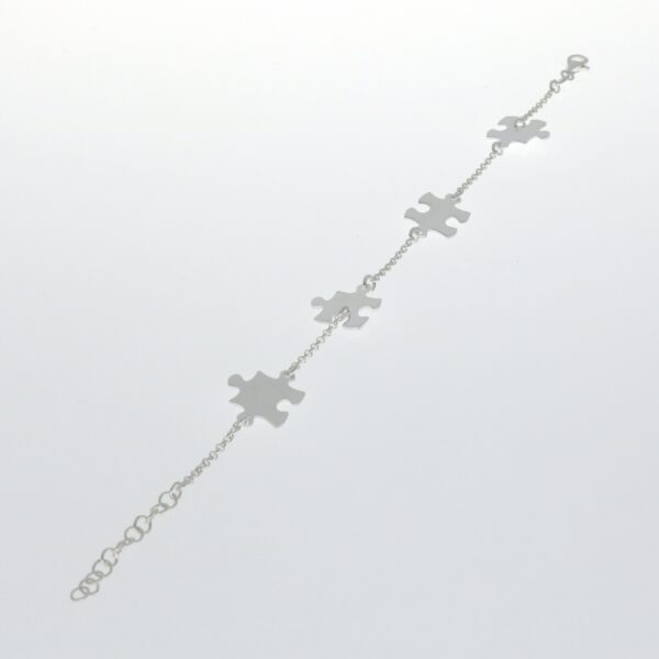 Pulsera rodiada con cadena rolo de 1.60 mm. Con piezas de puzle de 17 mm de largo y 14 mm de ancho.