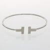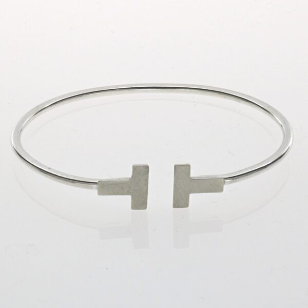 Pulsera rígida con hilo redondo de 2.50 mm, de diámetro 6.5 cm y dos T satinadas en los extremos.