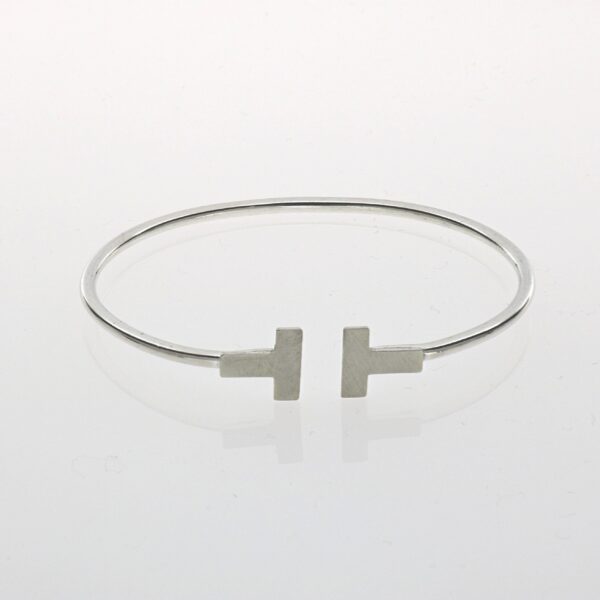 Pulsera rígida con hilo redondo de 2.30 mm, diámetro 5.5 cm y dos T satinadas en los extremos.