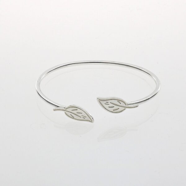 Pulsera rígida con hilo redondo de 2.35 mm, diámetro 6 cm y dos hojas en los extremos.