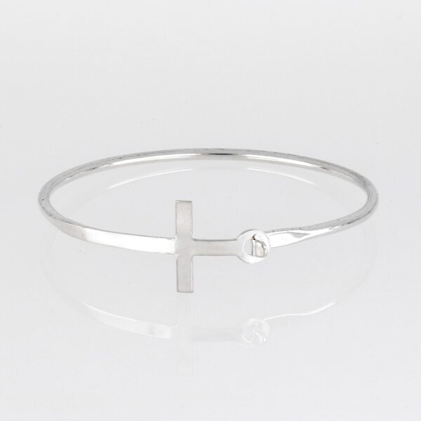 Pulsera rígida de 2.85 mm, 6.5 cm de diámetro y cruz junto al cierre. Plata de ley de 925 milésimas.