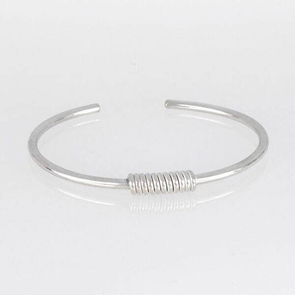 Pulsera rígida de tubo de 2.80 mm y 5,6 cm de diámetro con adorno de muelle fijo en el centro. Plata lisa de ley de 925 milésimas.