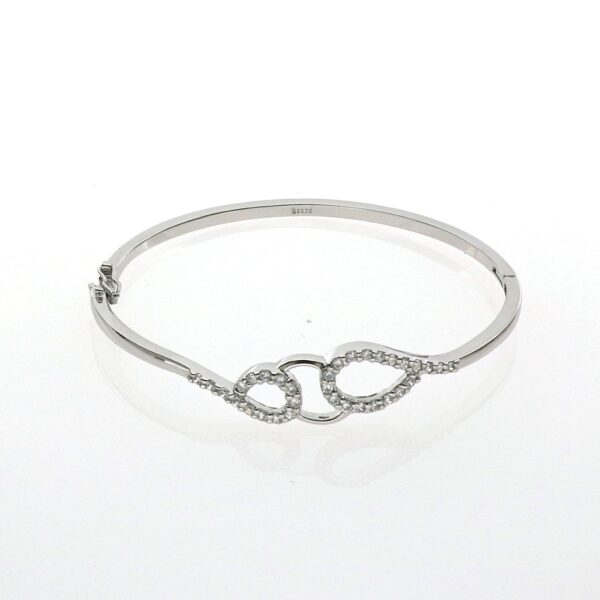 Pulsera rígida rodiada de 2.30 mm. Con decoración de circonitas en el centro. Cierre con seguridad en el lateral.