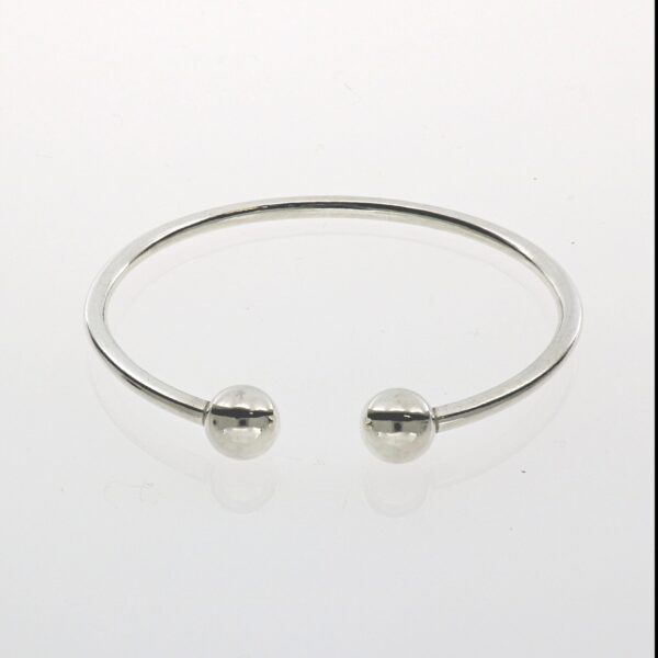 Pulsera rígida hilo redondo de 3.20 mm , diámetro 5 cm y bolas lisas de 10 mm en las terminaciones.