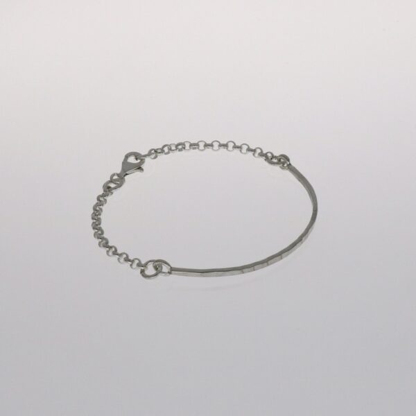 Media pulsera rígida plana de 2.30 mm con cruz en el lado y 5.60 cm de ancho. La otra mitad con cadena rolo de 3.20 mm y 8.5 cm de largo. Plata de ley de 925 milésimas.