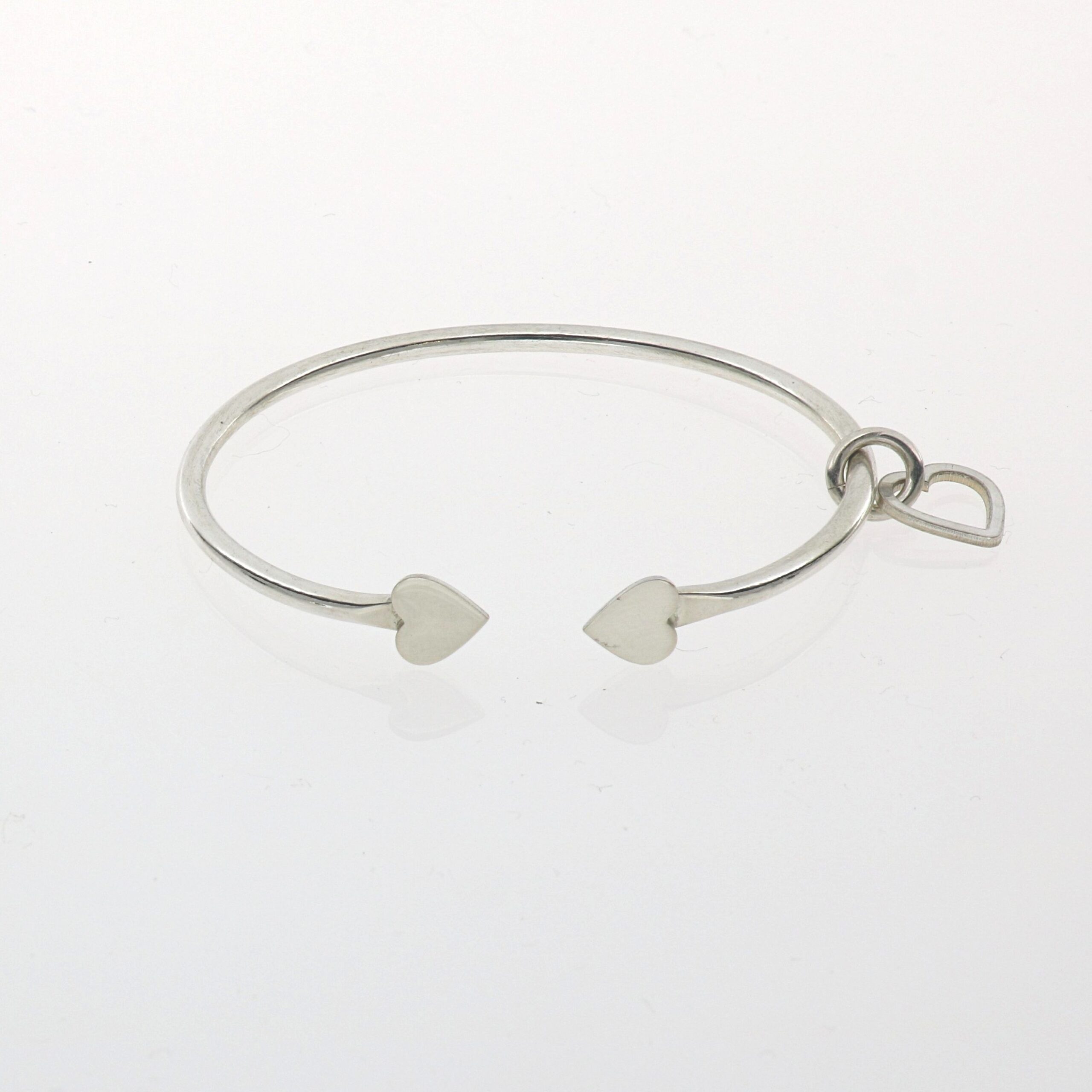 Pulsera rígida hilo redondo de 2.55 mm. Con tres corazones.Uno en cada extremo y otro calado colgando.