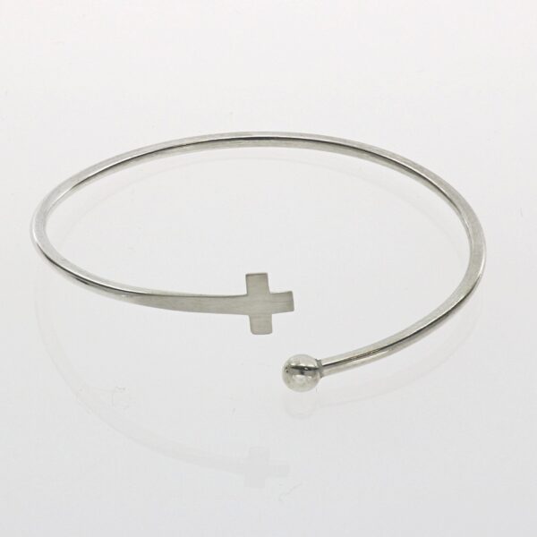 Pulsera rígida hilo de 2.30 mm y 6 cm de diámetro. con una bola de 5 mm en un extremo y una cruz satinada en el otro. .