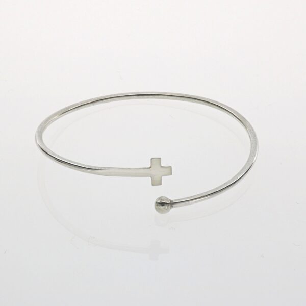 Pulsera rígida hilo de 2.30 mm y 5,7 cm de diámetro. con una bola de 6 mm en un extremo y una cruz satinada en el otro. .