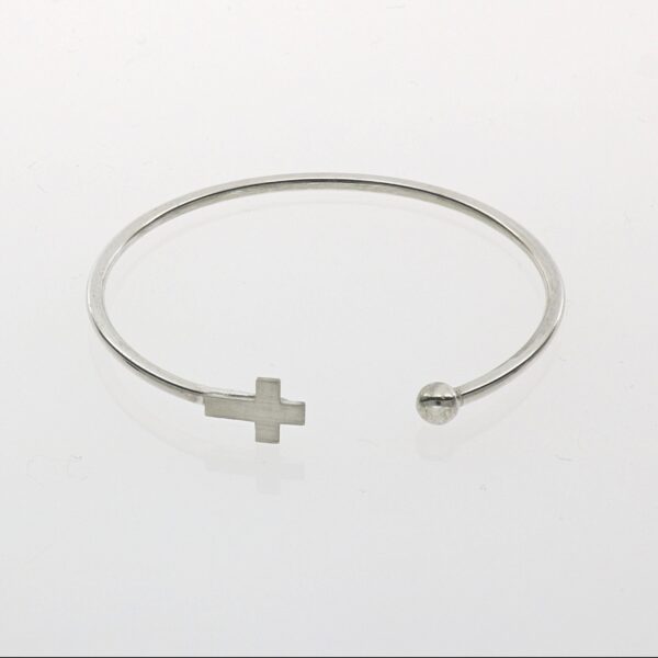 Pulsera rígida hilo de 2.30 mm y 5.50 cm de diámetro. con una bola de 5 mm en un extremo y una cruz satinada en el otro. .