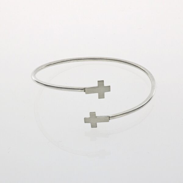 Pulsera rígida hilo de 2.50 mm, de diámetro 6 cm. Con cruces en las terminaciones de 12 mm de largo y 8.85 mm de ancho.