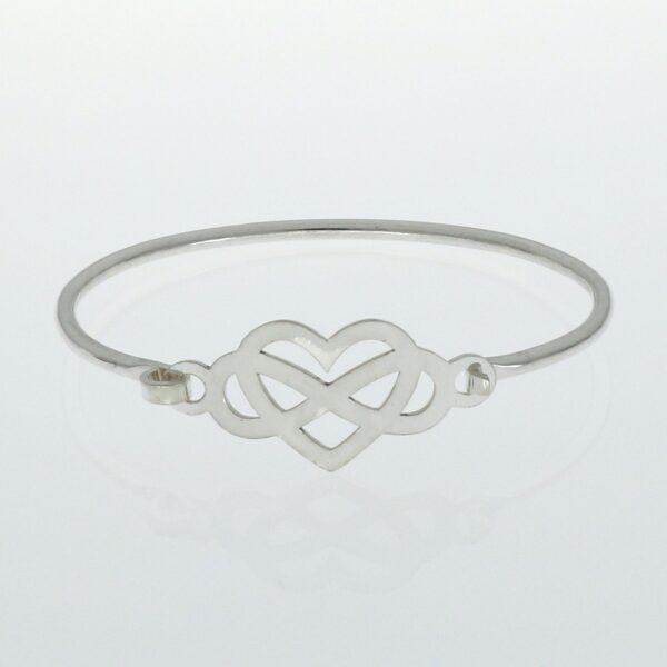 Pulsera rígida de 2.25 mm cerrado con un corazón entrelazado con un infinito de 15.75 mm de largo y 33.55 mm de ancho y 6 cm de diámetro.