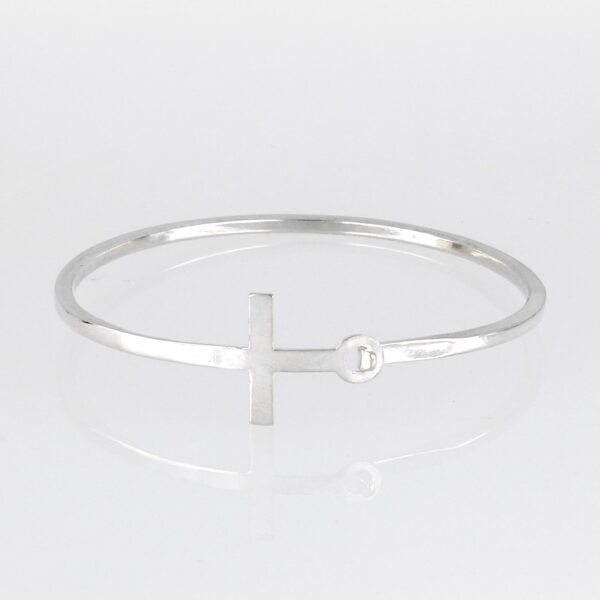 Pulsera rígida de 2.85 mm, 5.8 cm de diámetro y cruz junto al cierre. Plata de ley de 925 milésimas.
