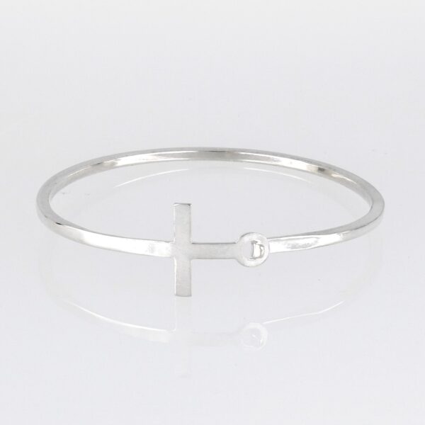 Pulsera rígida de 2.85 mm, 5,6 cm de diámetro y cruz junto al cierre. Plata de ley de 925 milésimas.