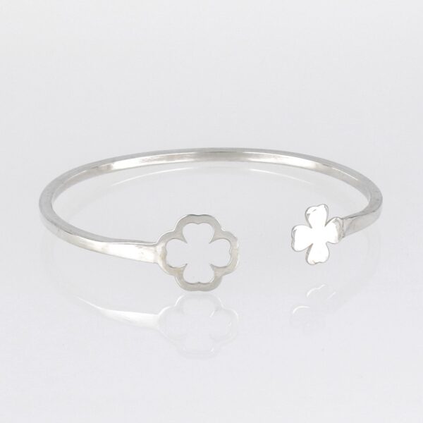 Pulsera rígida hilo cuadrado de 2.60 mm y 6 cm de diámetro,con trébol de cuatro hojas en los extremos.Plata de ley de 925 milésimas.