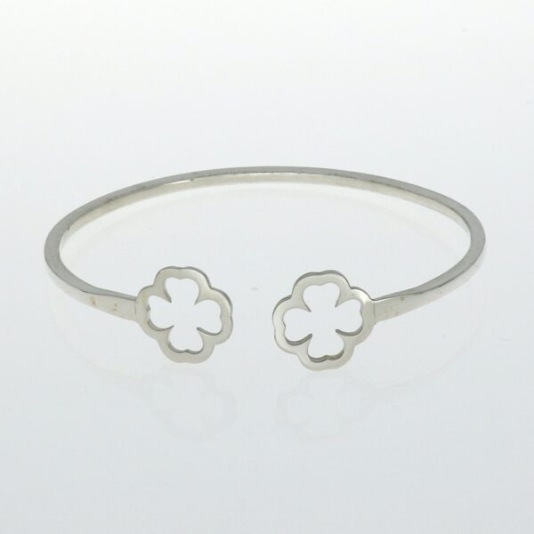 Pulsera rígida hilo cuadrado de 2.45 mm y 6 cm de diámetro,con trébol de cuatro hojas en los extremos.