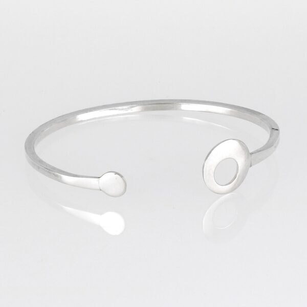 Pulsera rígida de 2.45 mm y 6 cm de diámetro con botón liso y hueco en las terminaciones. Plata de ley de 925 milésimas.