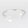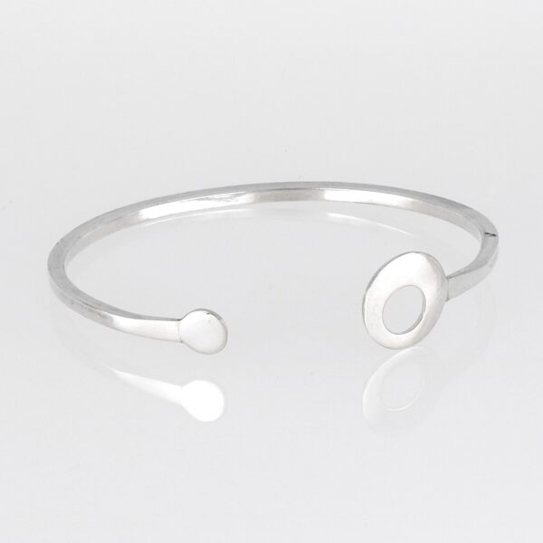 Pulsera rígida de 2.45 mm y 5.30 cm de diámetro con botón liso y hueco en las terminaciones. Plata de ley de 925 milésimas.