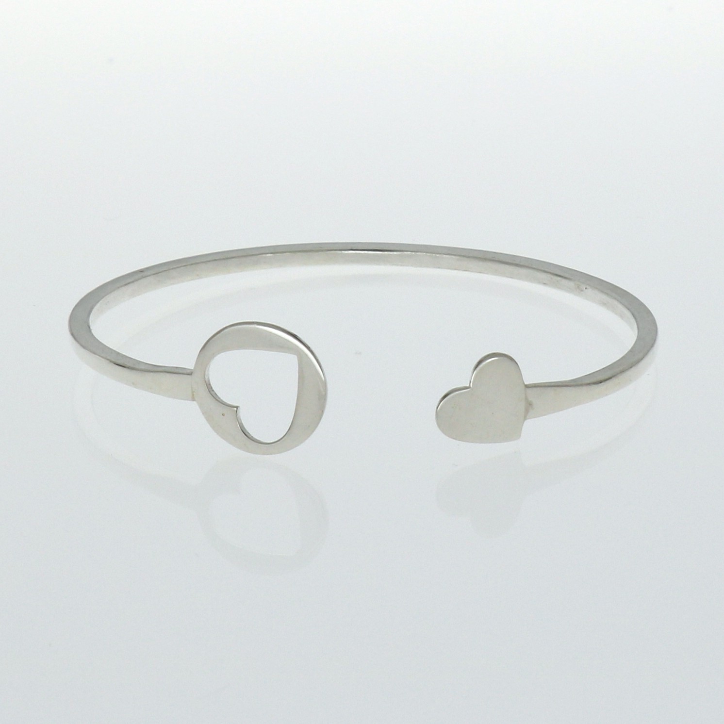 Pulsera rígida hilo cuadrado de 2.35 mm y 5.5 cm de diámetro,con corazón en los extremos.Plata de ley de 925 milésimas.