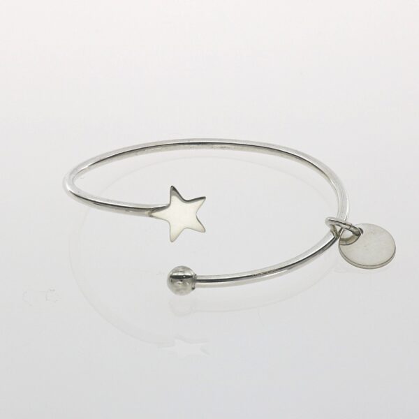 Pulseras, Sin piedrasPulsera rígida hilo redondo de 2.50 mm. Con una estrella en un extremo y una bola de 6 mm en el otro y una placa redonda colgando.