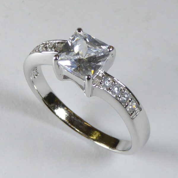 Solitario rodiado con circonita cuadrada en el centro de 6.10 mm y ocho circonitas de 1 mm engarsadas en el anillo.