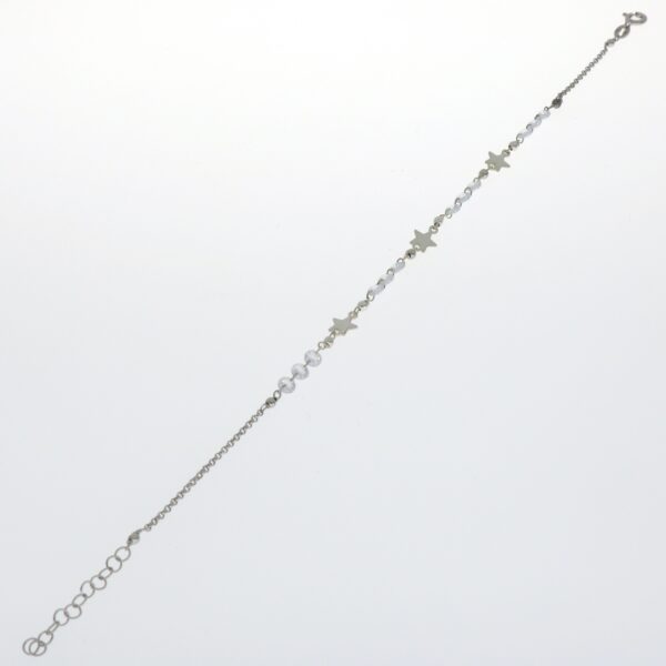 Tobillera con cadena rolo de 1.50 mm en los extremos.Con circonitas blancas de 3.90 mm y estrellas lisas colgando . 22 cm de largo y 3 cm de alargador.