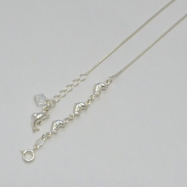 22.5 cm de largo y 3 cm de alargador con colgante de delfín y piedra blanca.Plata de ley de 925 milésimas.