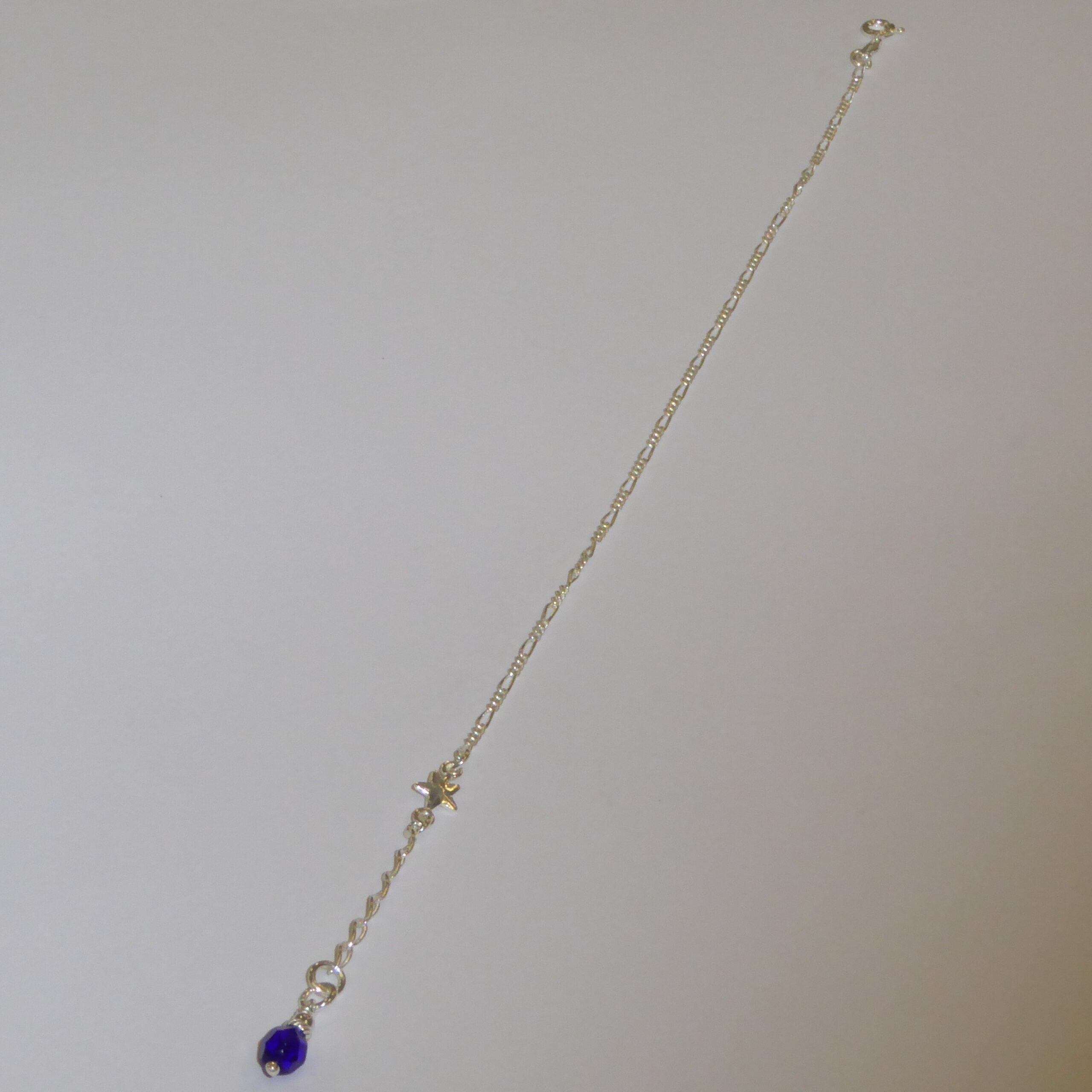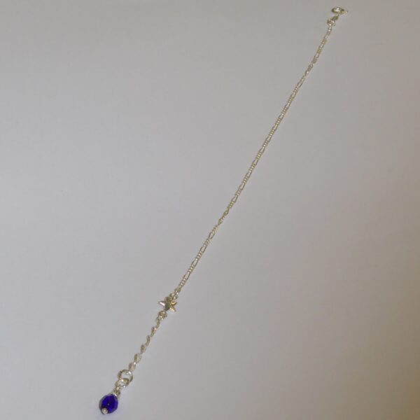 Tobillera con cadena 3+1. Con estrella y piedra azul en el cierre. 20 cm de largo y 3 cm de alargador. Plata de ley de 925 milésimas..